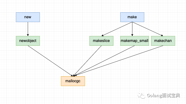 make为map和channel申请内存底层分别是runtime.makemap_small,runtime.makechan,也是同样调用mallocgc,这里就不继续讨论了。