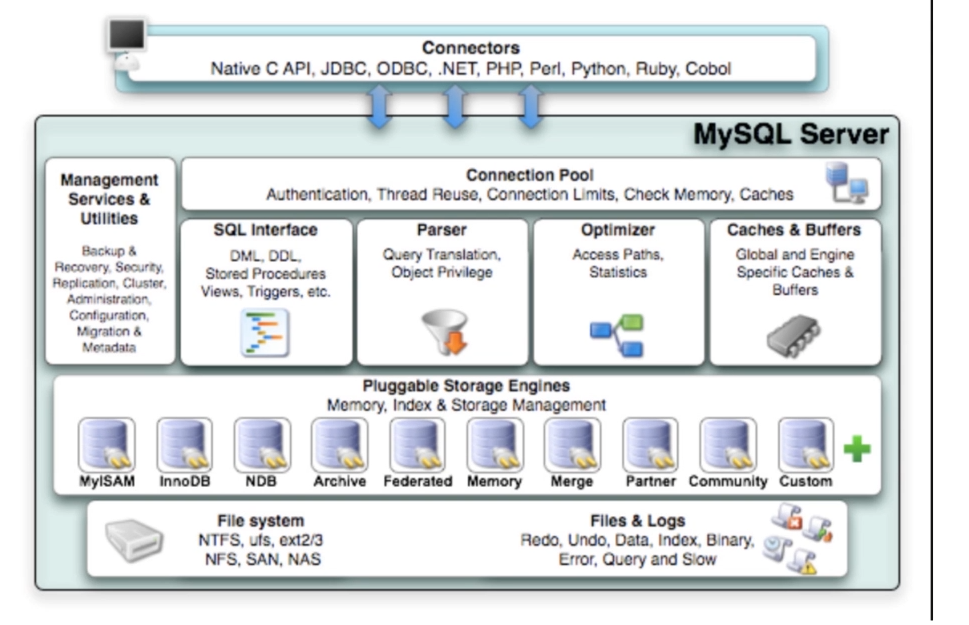 - 最上面是一些客户端和连接服务, 不是MySQL特有的,所有基于网络的C/S的网络应用程序都应该包括 连接处理、认证、安全管理等。