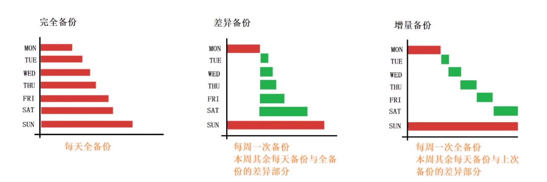 | 优势 | 最快的恢复速度,只需要上一次完全备份就能恢复 | 相比增量,更快也更简单,并且只需要最近一次的 完全备份和最后一次的差异备份就能恢复 | 备份速度快,较少的空间需求,没有重复的备份文件 |