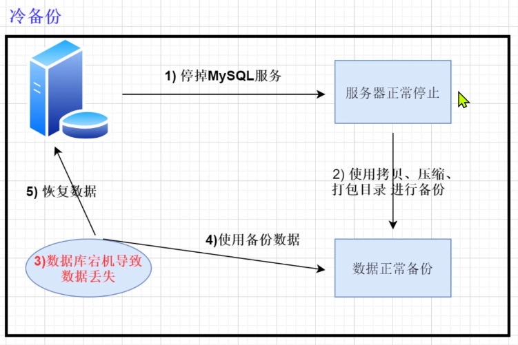 冷备份指的是当数据库进行备份时, 数据库不能进行读写操作, 即数据库要下线