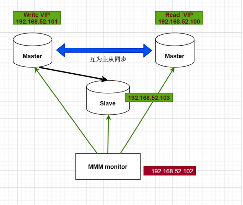 除了管理双主节点,MMM 也会管理 Slave 节点,在出现宕机、复制延迟或复制错误,MMM 会移 除该节点的 VIP,直到节点恢复正常。