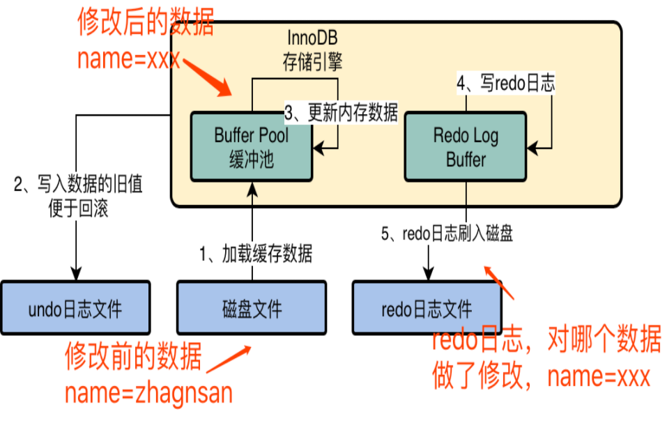 - 将更新前的旧值写入undo日志文件,便于回滚。