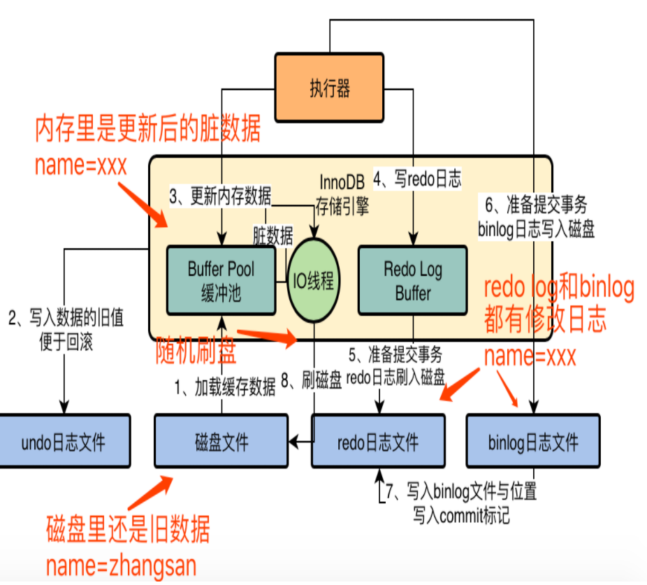 - 事务提交成功了,内存中的buffer pool数据已经更新,磁盘里redo日志和binlog日志都记录了更新的操作。MySQL后台的一个IO线程会随机把buffer pool中修改的数据刷到磁盘里。