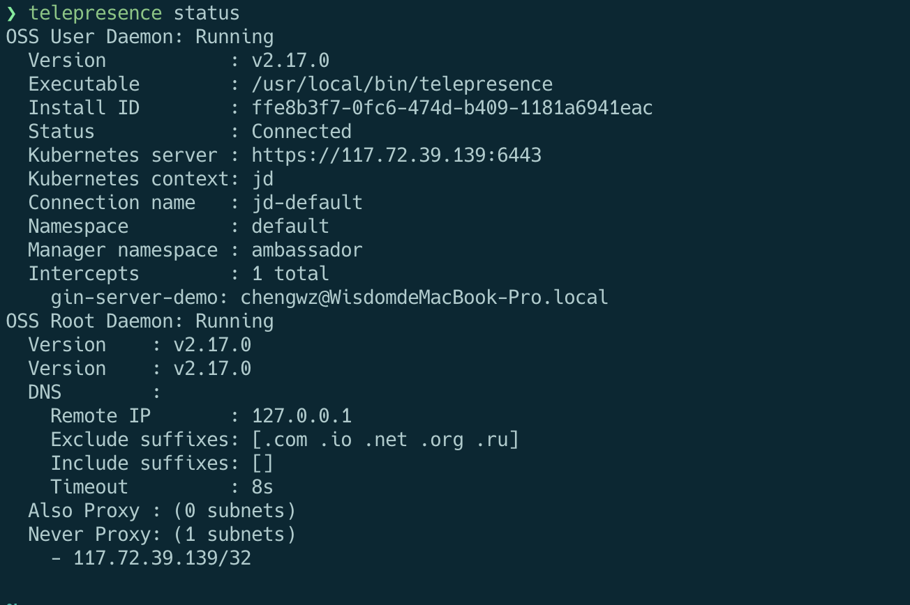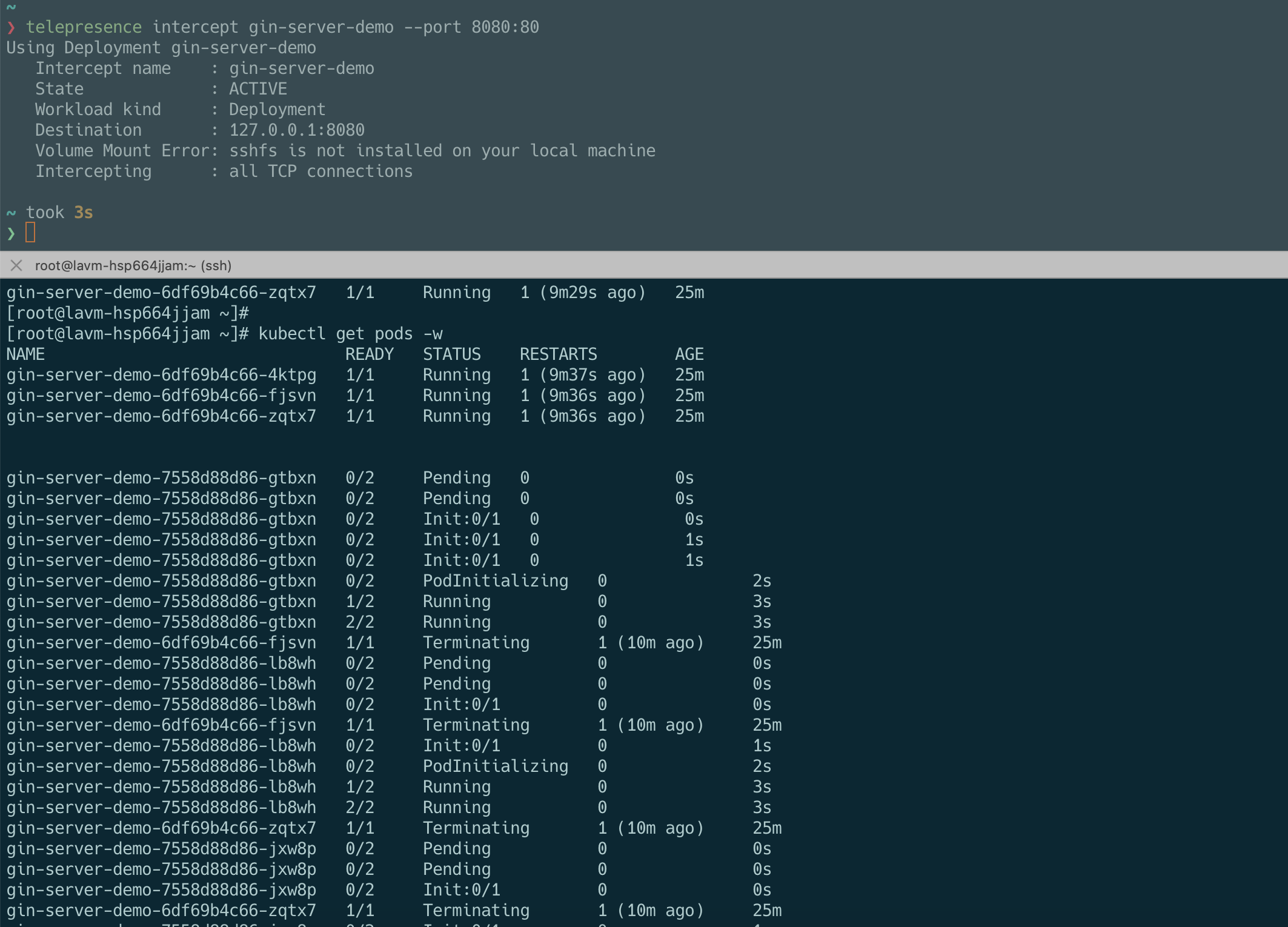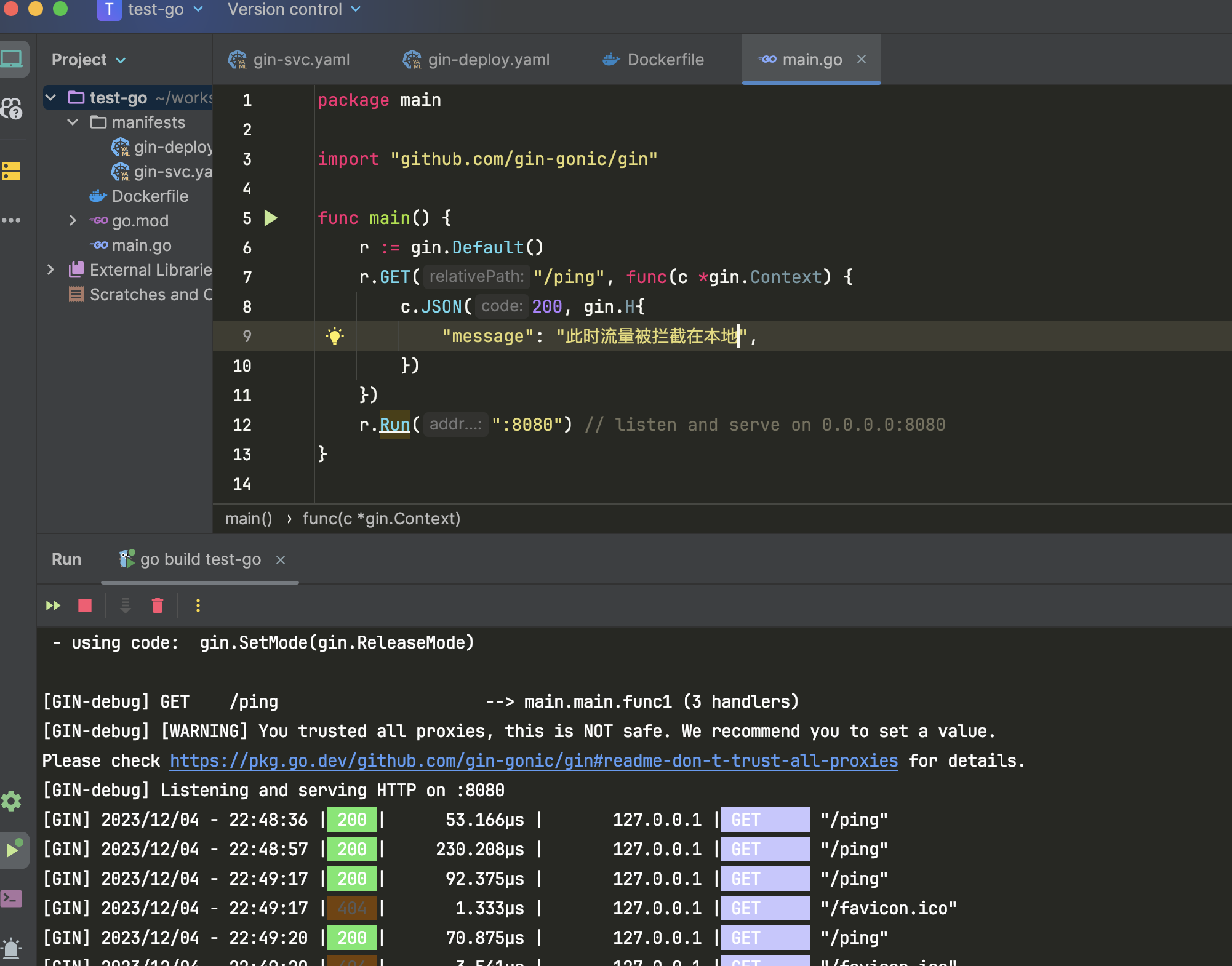 这时候你在本地跑这个应用,就会发现 访问远程服务器的流量已经被拦截在本地了,也就是说你本地起的服务,在远程也可访问到了,很容易做修改,不必等待ci过程了。仅仅受限于你本地编译的速度了。