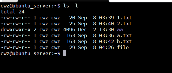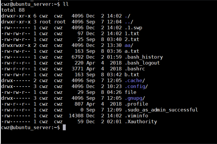 - ls -l 详细内容(权限、inode占用数量、属主、属组、大小、修改时间或创建时间、文件或文件夹名字)