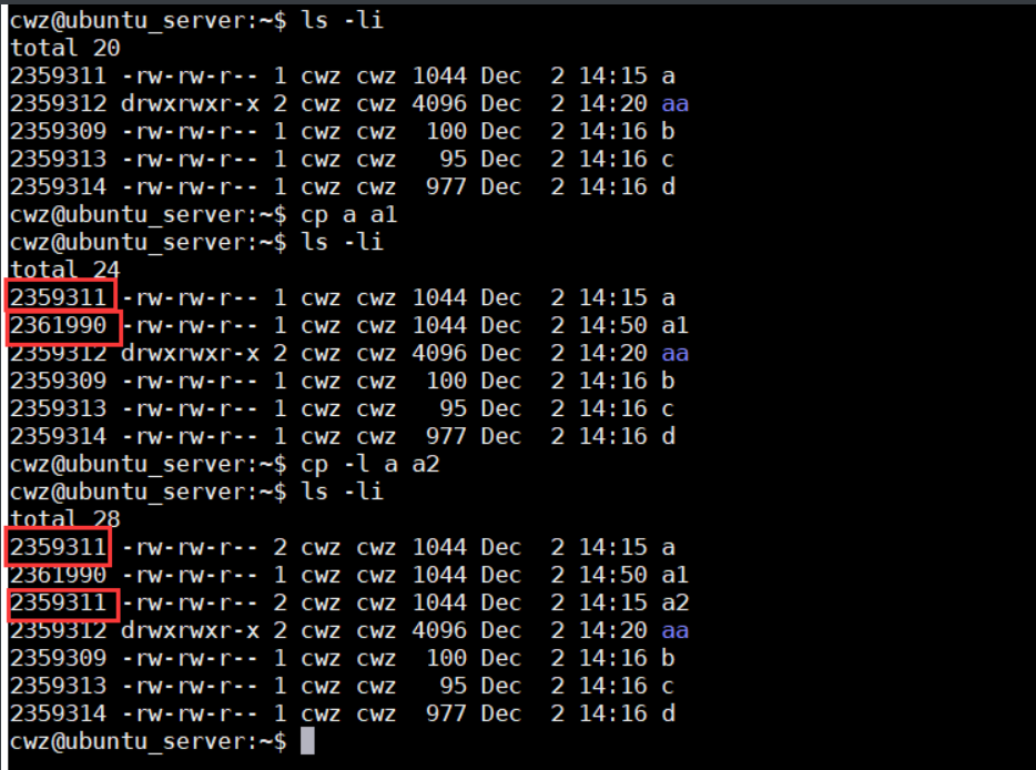 - cp -l 硬链接拷贝(ls -li) 如 :cp -l a a2 这样拷贝inode值是一样的
