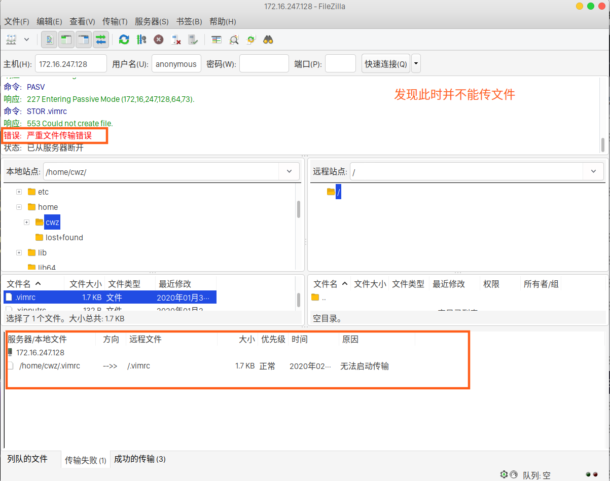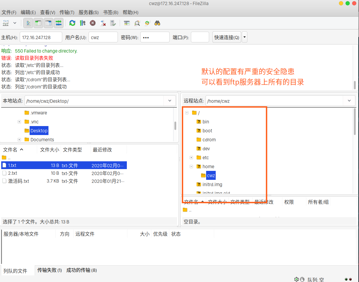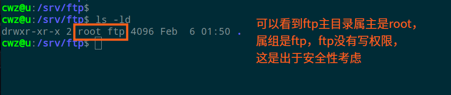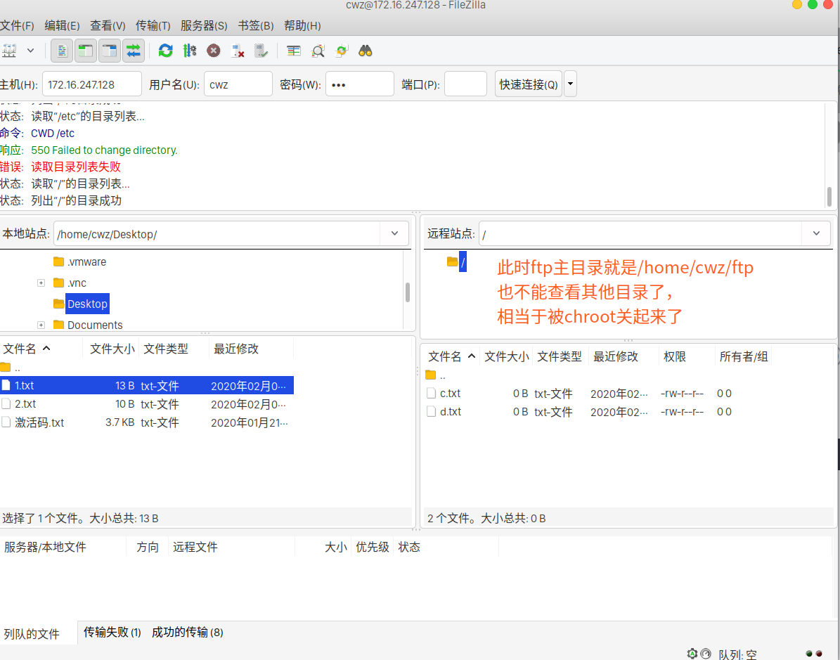 当cwz这个用户以ftp服务登录进来时,ftp获得的主目录将不再是cwz的主目录,而是另外一个目录。