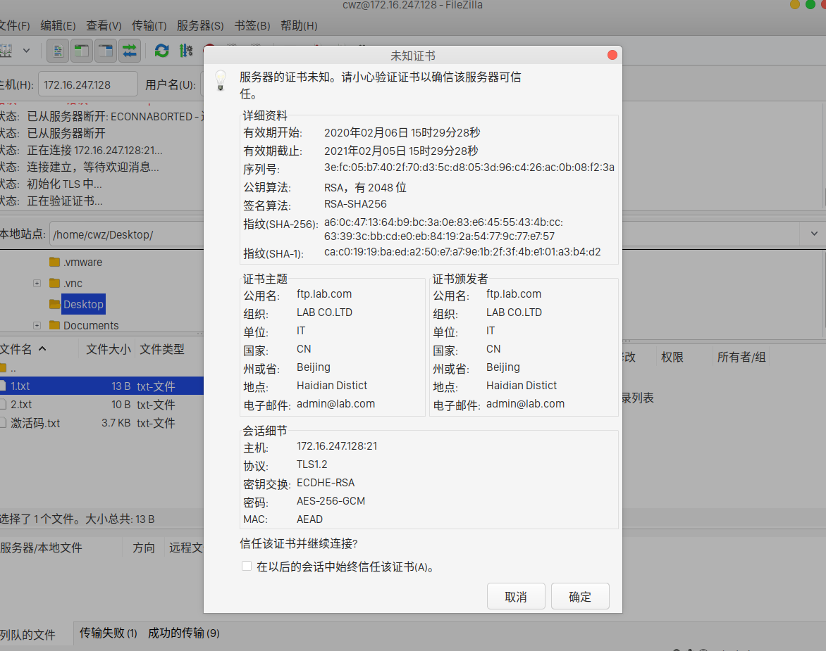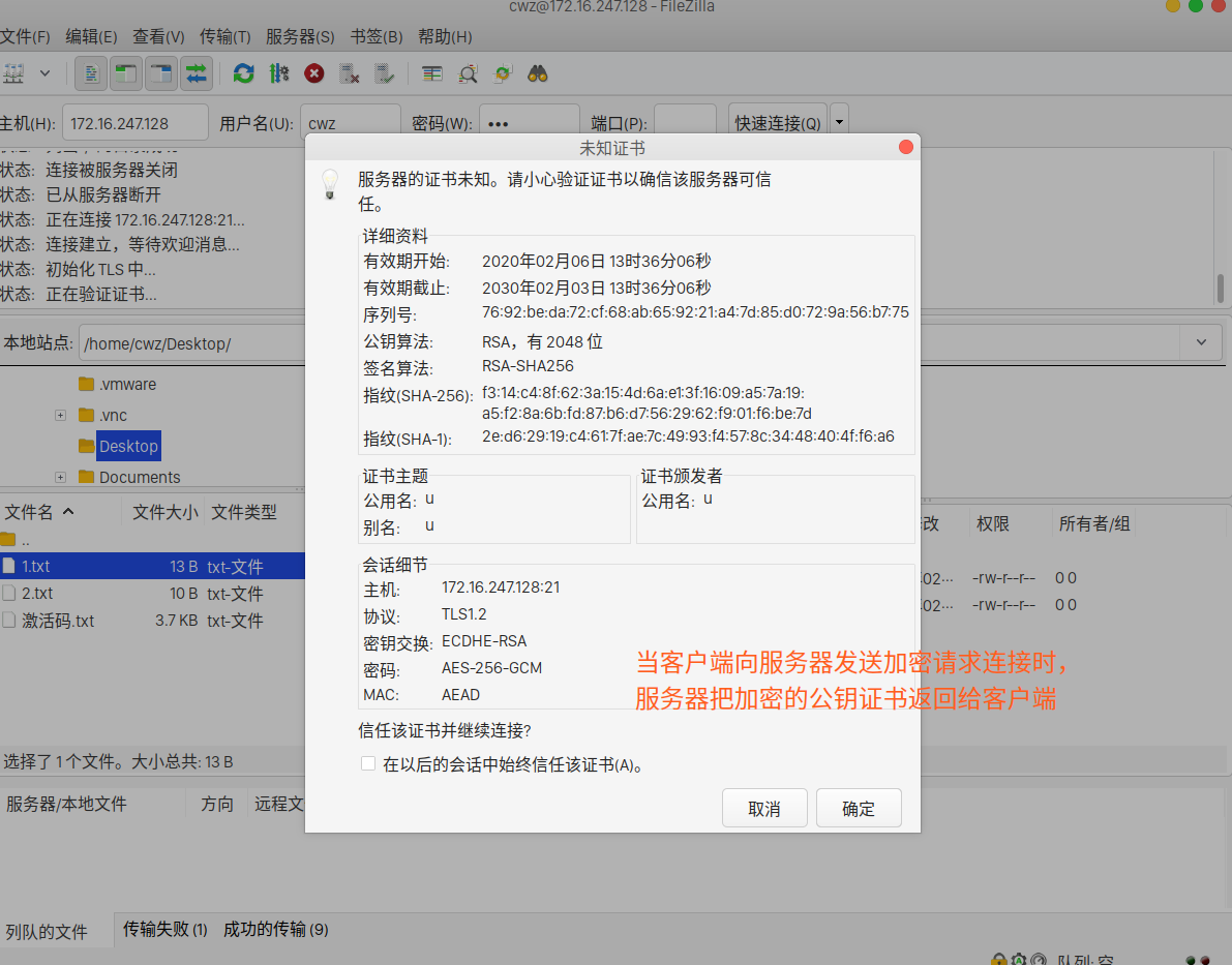 客户端连接上ftp服务器, FTP服务器会发一个含有公钥的证书, 以后客户端所有发送的数据都要经过公钥加密之后才会发送给服务器,服务器然后用私钥解密