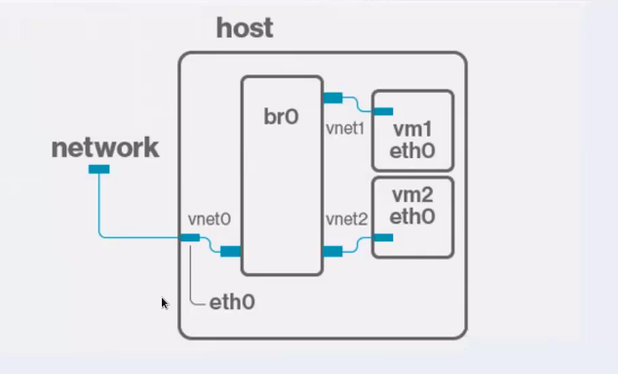 但是我们可以创建网桥br0,把物理网卡eth0加入到网桥里,把虚拟机的每一个网卡都加入到网桥里,通过网桥实现向外部网络进行通信。这样在外部网络看来,因为大家都是通过网桥连接到外部网络上去的,里面包含物理网卡和虚拟网卡。所以通过网桥,可以将外部的网络结构透传到内部的虚拟机上。比如说外部有DHCP服务器给外部网络分发IP地址,虚拟机通过网桥和外部网络相连接,外部网络DHCP分发ip地址的时候也可以给虚拟机分发一个外部的IP地址。这样的话,在外界网络看来,里面的虚拟机也是一个具有外部网络合法IP地址的独立计算机。所有外界可以通过网桥来访问虚拟机上的服务。